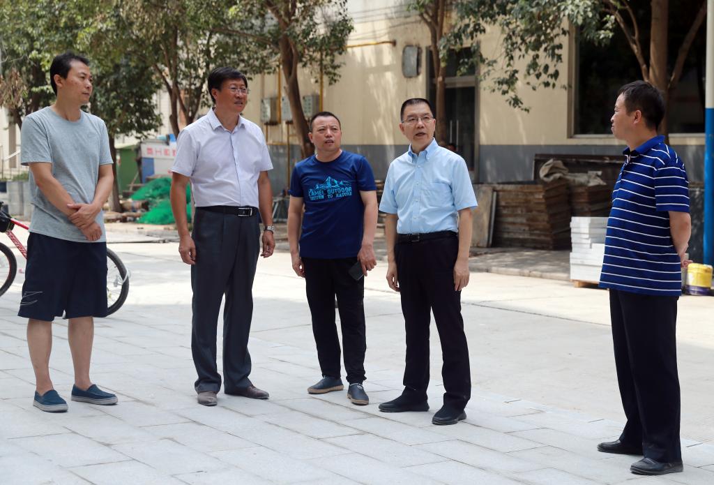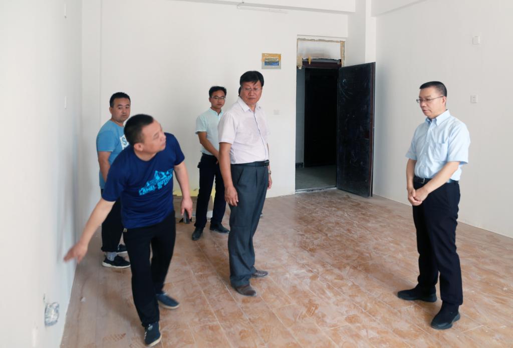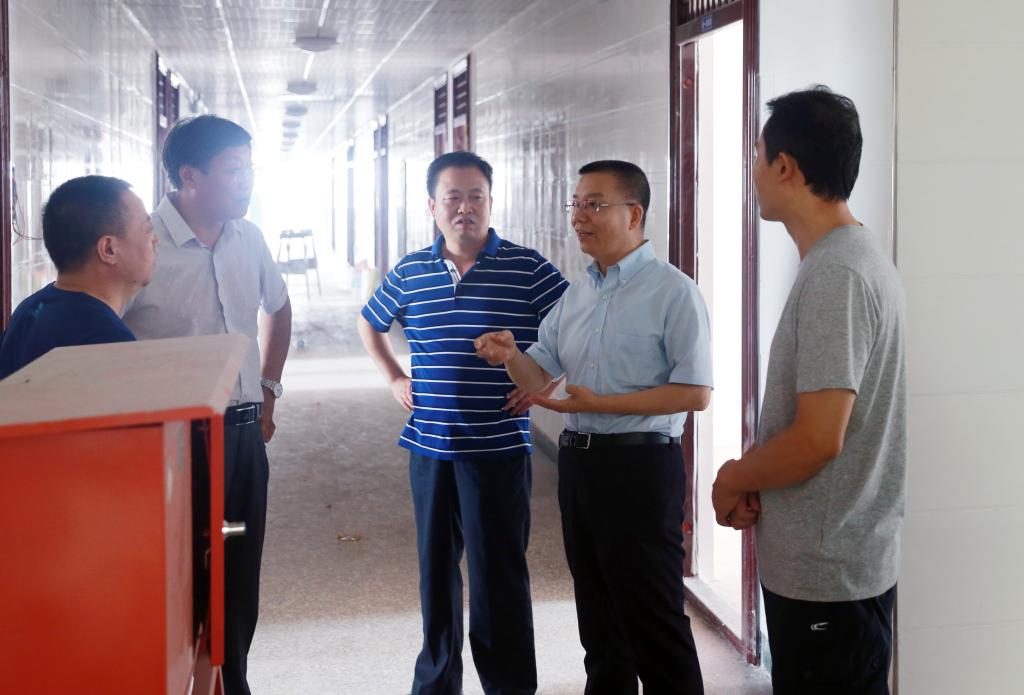 8月9日上午,我院党委书记惠朝阳和咸阳市建筑安装工程总公司副总经理胡彦昌、陕西百威建设监理有限公司总监理工程师王飞超、学院基建处负责人一起深入到笃学楼A装修改造工程项目施工现场进行检查指导。