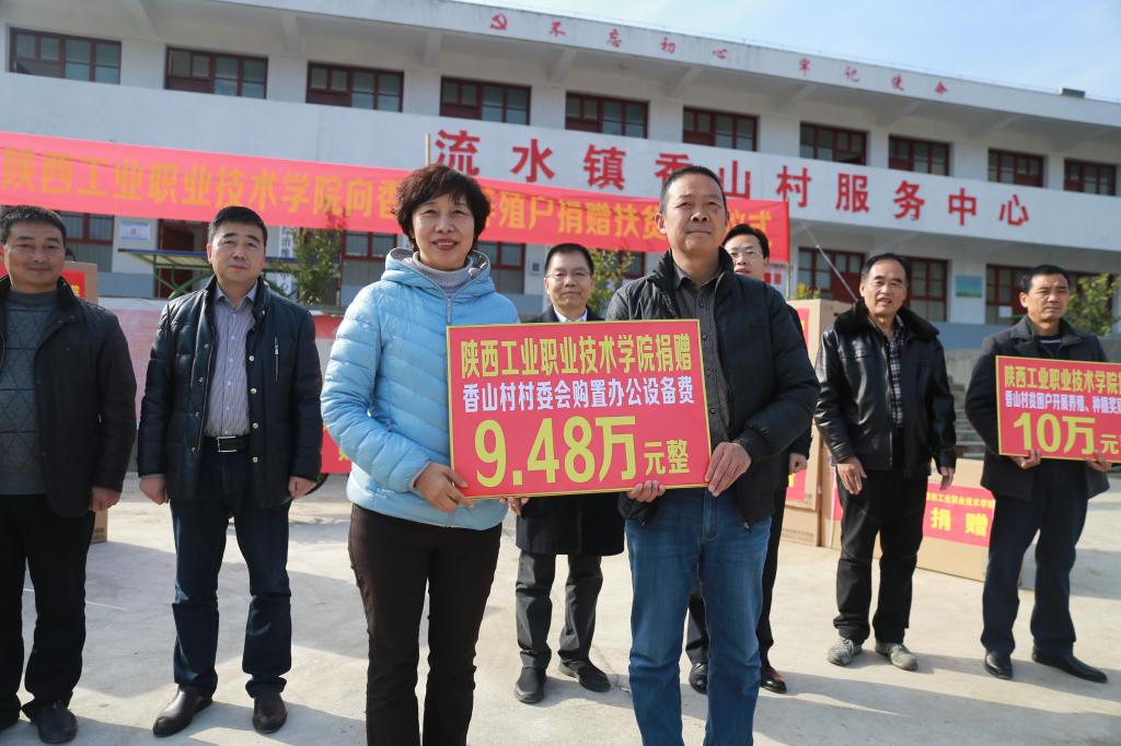 11月24日,陕西工业职业技术学院2018年“两联一包”养殖、种植奖补资金发放暨办公设备捐赠仪式在安康市汉滨区流水镇香山村举行。我院党委书记惠朝阳、院长张晓云、纪委书记康强及学院扶贫工作小组成员,汉滨区区委常委、组织部部长郭正峰,流水镇党委书记陈刚和香山村两委班子、村民代表参加了仪式,康强同志主持仪式。