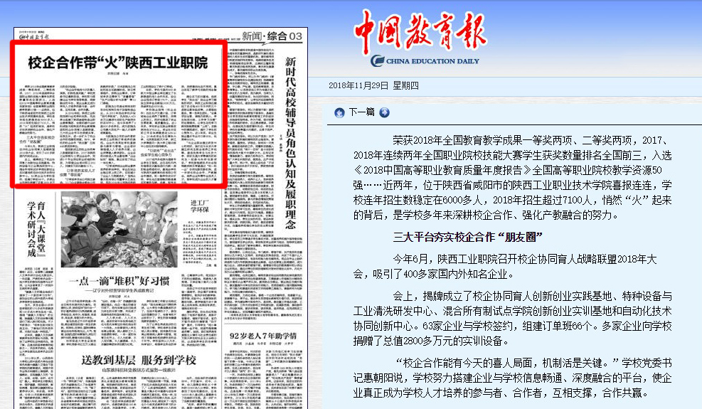 荣获2018年全国教育教学成果一等奖两项、二等奖两项,2017、2018年连续两年全国职业院校技能大赛学生获奖数量排名全国前三,入选《2018中国高等职业教育质量年度报告》全国高等职业院校教学资源50强……近两年,位于陕西省咸阳市的陕西工业职业技术学院喜报连连,学校连年招生数稳定在6000多人,2018年招生超过7100人,悄然“火”起来的背后,是学校多年来深耕校企合作、强化产教融合的努力。
