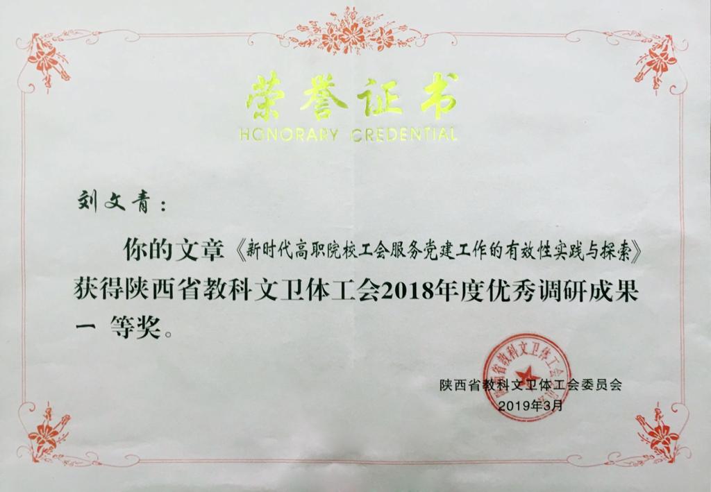 近日,陕西省教科文卫体工会对2018年度优秀调研成果和优秀调研单位进行通报表彰(陕科文卫体工字[2019]9号),我院工会主席、统战部部长刘文青获优秀调研成果一等奖,财务处处长邓丽萍和工会祁广科分获三等奖。刘文青同志出席会议并上台领奖。我院工运理论研究工作已连续八年获省教科文卫体工会表彰。