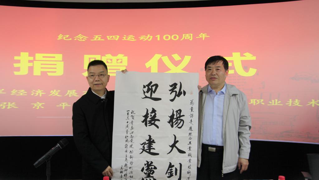 报告会开始前,李建生同志一行与我院领导班子和思政课专职教师、学生代表围绕“传承红色基因,重温建党历史”的主题进行了座谈。中共中央党校于泳老师代表有关方面向我院捐赠了习近平总书记的著作《摆脱贫困》,书法家张京平先生向我院赠送了“青春心向党,建功新时代”和“不忘初心,大钊精神”书法作品。