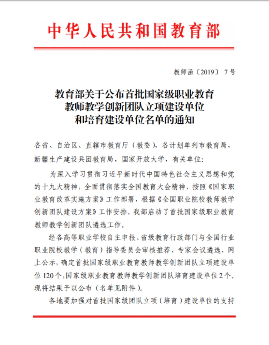 2019年7月,按照教育部“全国职业院校教师教学创新团队”建设工作安排,我院积极筹备申报工作。经过校内遴选、学院申报、省教育厅初评、教育部评审等环节,“机电一体化技术”教学创新团队通过评审。全国首批国家级职业教育教师教学创新团队立项建设单位共120个,陕西省共3所高职院校入选。