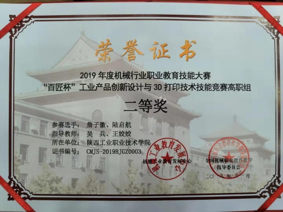 11月23日至25日,由机械工业教育发展中心、全国机械职业教育教学指导委员会主办,天津职业大学、国家増材制造创新中心和西安増材制造国家研究院承办的2019年度机械行业职业教育技能大赛——“百匠杯”工业产品创新设计与3D打印技术技能大赛闭幕式在天津职业大学举行。我校航空工程学院学生詹子徽、陆启航在比赛中发挥出色,荣获二等奖。航空工程学院教师王姣姣受邀担任本次比赛裁判员。