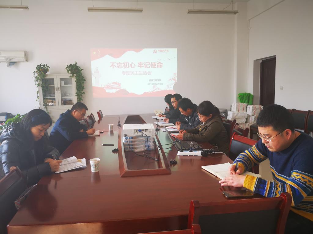 12月9日下午,机械工程学院党总支在行知楼E412召开“不忘初心、牢记使命”专题民主生活会。学院党委书记惠朝阳同志参会并指导,督察组成员成冬梅同志全程指导监督,机械学院领导班子成员及党总支委员参加会议,会议由党总支书记苏宏志主持。