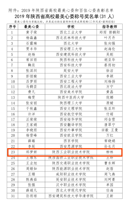 为贯彻教育部《高等学校学生心理健康教育指导纲要》及省教工委心理育人工作部署,加强高校心理委员工作,推展心理助友优秀成果,陕西省高校心理健康教育研究会开展了“2019年陕西省高校最美心委和百佳心委推选活动”。我院材料工程学院质检1801班郑梦妍荣获“最美心委称号奖”,土木工程学院造价1802班张欢荣获“最美心委提名奖”,航空工程学院机器人1802班杨朝阳、土木工程学院工程造价1808班叶启园、财经与旅游学院会计1804班南婷荣获“百佳心委荣誉奖”;柳林老师获优秀指导老师奖。