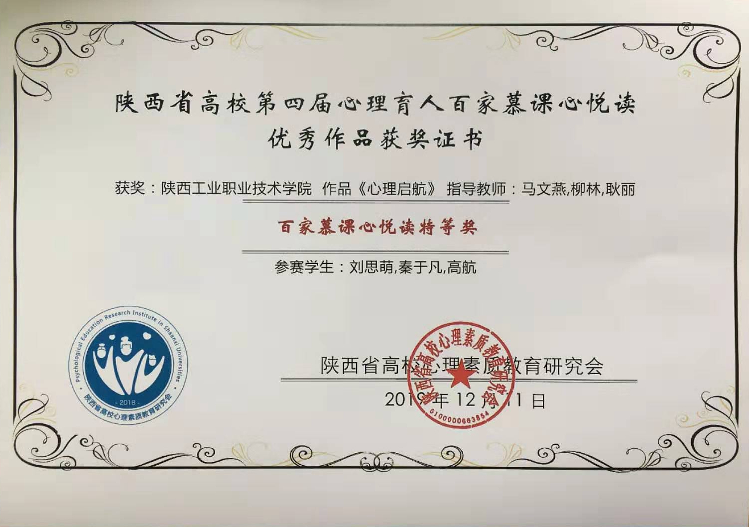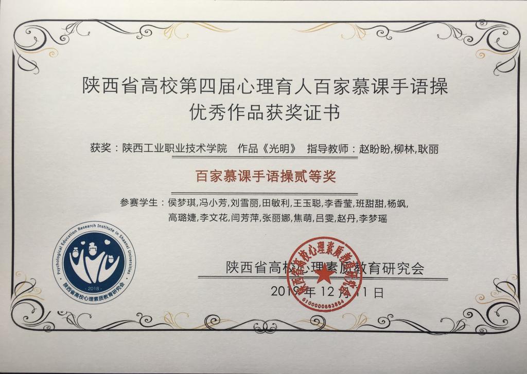 近日,第四届陕西省高校心理育人百家慕课学生作品展评落下帷幕,由陕西工业职业技术学院学生处心理咨询中心推荐的财经与旅游学院刘思萌等三名同学参演的《心理起航》荣获第四届陕西省高校心理育人百家慕课心悦读特等奖,由侯梦琪等十六名同学参演的《光明》荣获第四届陕西省高校心理育人百家慕课手语操二等奖,马文燕、赵盼盼两位老师分别获得优秀指导教师奖。