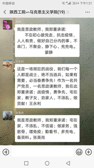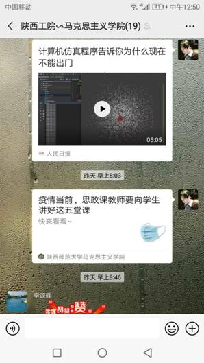开展“抗疫思政专题分享”:马院防疫工作组成员紧密结合思政课程建设需要,积极遴选思政教育特色鲜明的相关内容,适时分享于马院工作微信群,思政课教师结合专题展开了热烈的讨论和互动,保证疫情防控期间学习、教育不断线。