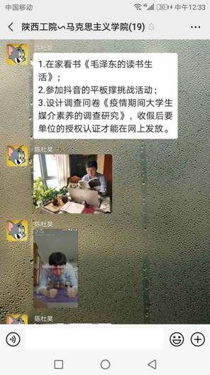 开展“战疫五个一”活动:马克思主义学院面向部门广大党员及教师,发出“制定一个居家计划、阅读一本思政书籍、挖掘一个战疫思政主题、进行一项体育锻炼、学唱一首防疫新歌”的倡议,要求每位职工根据自身情况选取一项或几项内容并坚持实施,同时将实施过程以图片或者其他形式发送至马院工作微信群里,以实际行动做到停工不停学、宅家有意义。