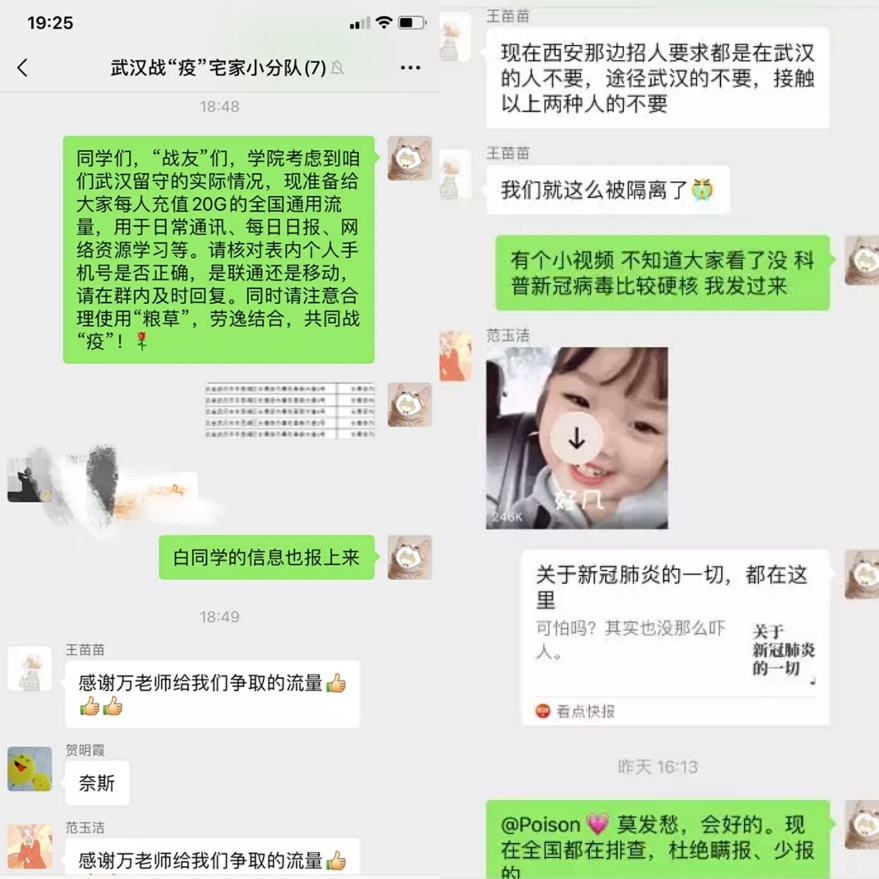 商贸与物流1706班王苗苗、贺明霞、范玉洁、谢园聪、赵伟涛5名同学因赴武汉企业实习并担任假期值守任务,疫情发生后无法返回,5名同学主动配合当地防疫工作,相互鼓励,自己解决饮食问题,按时作息,展现了工院学子的团结精神与韧性。