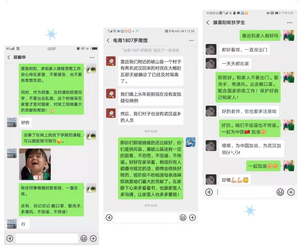 危机也是契机,生活就是功课。虽不能与学生面对面的交流,各位教师党员依旧通过网络渠道走近学生身边,并通过微信群汇报自己近期的结对帮扶工作。