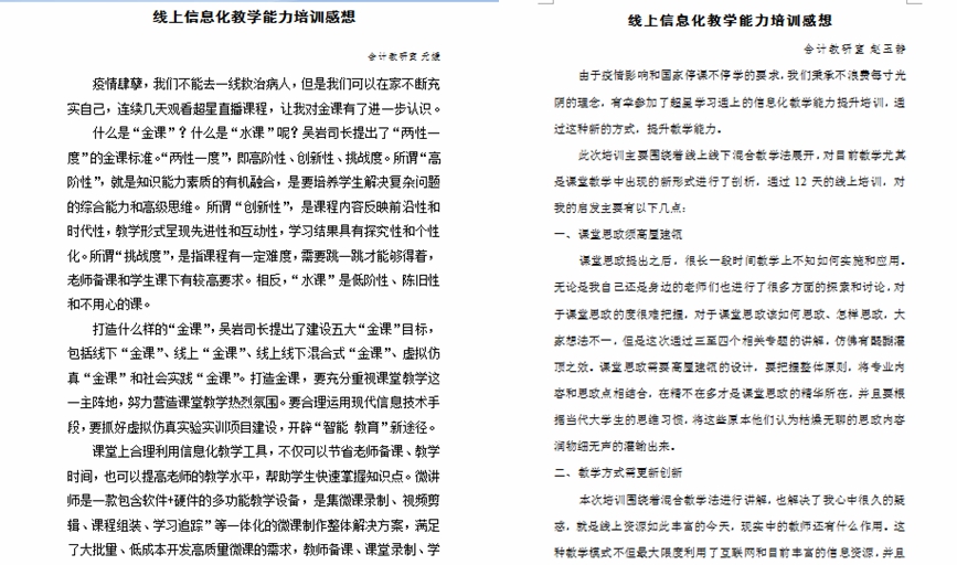 本次培训从技术先导课、综合提升课、重点突破课、示范指导课四个主题重点解决教师如何基于“一平三端”进行备课、用课、学课、管课等问题,及线上教学设计与教法示范教学。财经与旅游学院全体教师学习过程中边学边做笔记,分别从教学模式、课程设计、课程思政、教学评价等方面对教学进行认真思考、总结,并写出个人学习感想。