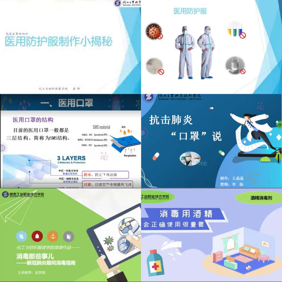 化工教研室的彭梦姣博士利用专业知识制作了《消毒那些事儿—新冠肺炎期间消毒指南》微课,全方位展现了新冠肺炎期间的消毒策略,为大家答疑解惑。王晶晶副教授制作了《抗击肺炎“口罩”说》微课,从医用口罩分类入手,分析口罩结构,讲口罩生产过程,一方口罩虽只有巴掌大小,背后却是一张纵横石油化工、塑料制品、纺织的巨网。服装设计教研室秦辉老师利用专业知识制作了《医用防护服制作小揭秘》微课,详细介绍了医用防护服的作用,从选材到制作成衣的全部过程,让大家了解了服装行业在疫情中发挥的重要作用。这些微课选题独特,内容丰富多彩,突出了专业优势,也为当前的自主招生加强了宣传。