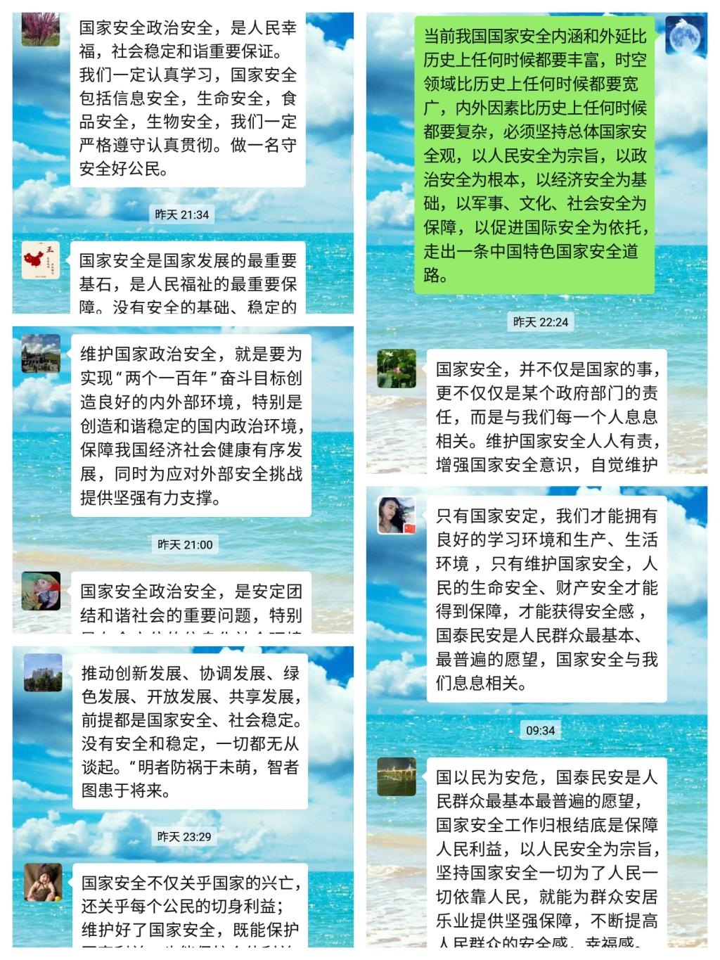 紧紧围绕着“坚持总体国家安全观,统筹传统安全和非传统安全,为决胜全面建成小康社会提供坚强保障”活动主题,图书馆一方面按照学院宣传部统一安排,组织教职工利用线上平台集中学习国家安全法治宣传内容,以丰富的图片、视频、案例,大力宣传总体国家安全观和《国家安全法》《反间谍法》《网络安全法》《保守国家秘密法》等国家安全法律法规;另一方面积极动员教职工通过在线讨论、在线党日活动的形式强化学习交流,不断提高国家安全宣传教育的影响力和传播力。