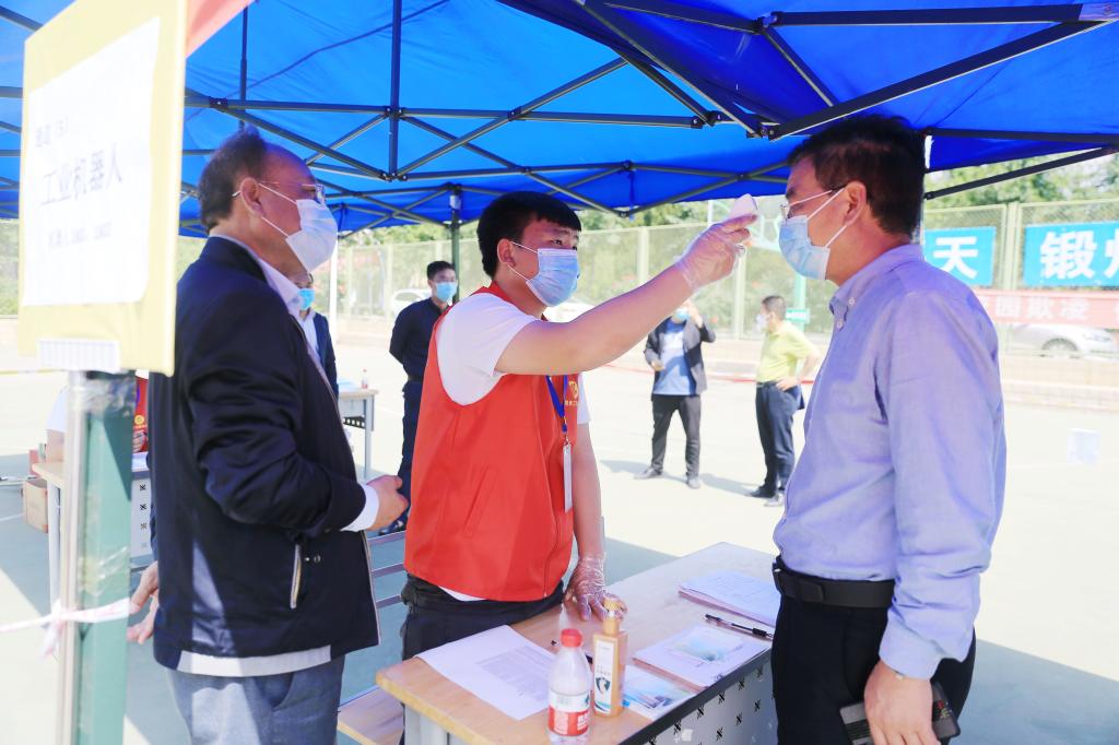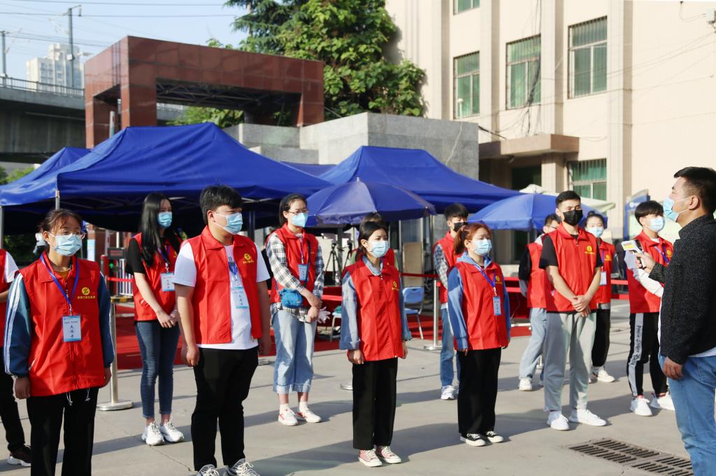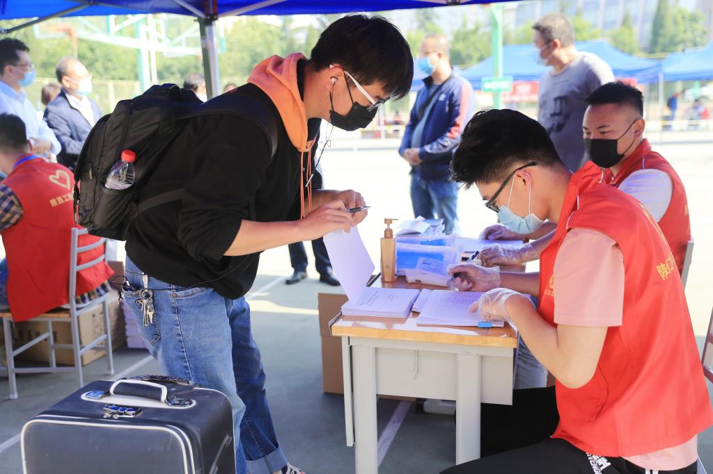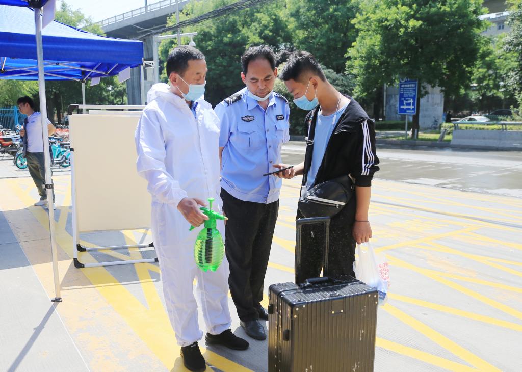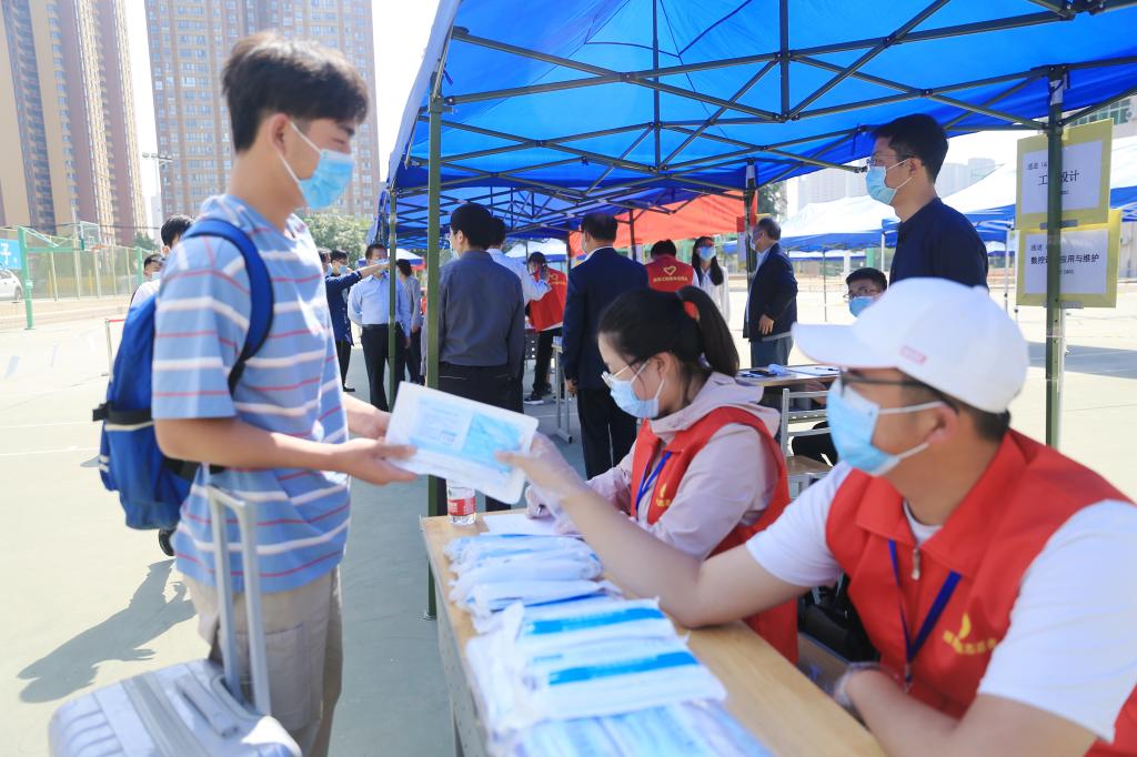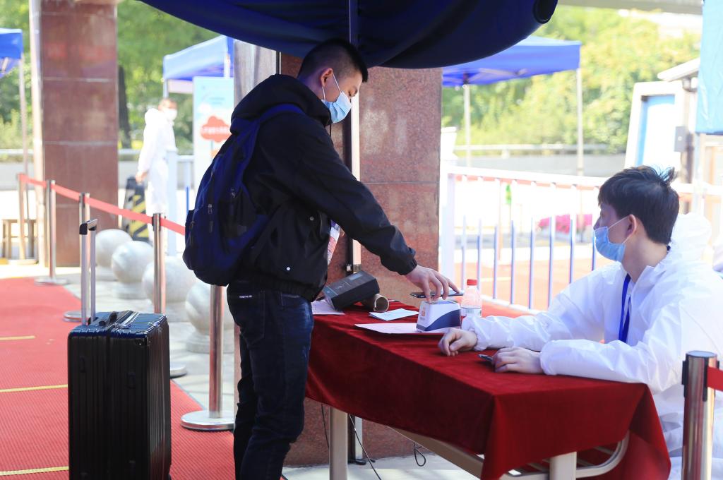 多重检测,重细节保障健康安全。学生入校检测是做好防疫工作的第一道安全屏障。早上七点整,各二级学院教师、学生志愿者和保卫处执勤人员,已经身着防疫服、背好消毒桶、手持测温枪到达岗位。在校门口设置的学生通道前,返校学生间隔1米以上有序排队进入行李消杀区域,待出示学生证、健康码,再经测量体温正常后,进入各二级学院登记处进行信息登记,提交《健康承诺书》,领取备用口罩和防疫知识手册。