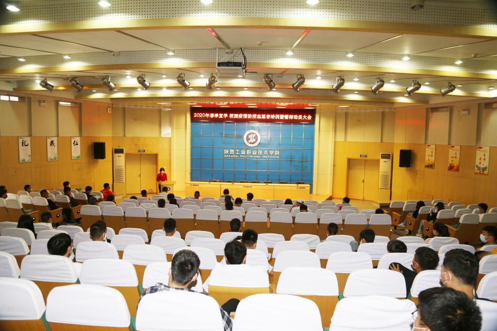 为迎接新学期复学复课,确保校园疫情防控各项工作有序、顺利进行,陕西工业职业技术学院2020年春季复学校园疫情防控志愿者培训暨誓师动员大会在学术会堂举行,党委副书记贺天柱出席会议并讲话,团委书记赵双军、学生处副处长耿丽、学生处教育管理科科长刘冽与各二级学院的100余名志愿者参加了会议。