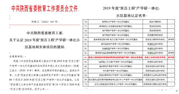 日前,我院结对帮扶礼泉县共建的“陕西工业职业技术学院产学研一体化示范基地”项目被省教工委认定为2019年度“双百工程”产学研一体化示范基地。