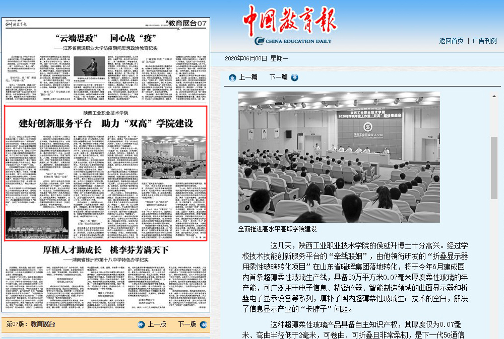 全面推进高水平高职学院建设这几天,陕西工业职业技术学院的侯延升博士十分高兴。经过学校技术技能创新服务平台的“牵线联姻”,由他领衔研发的“折叠显示器用柔性玻璃转化项目”在山东省曜晖集团落地转化,将于今年6月建成国内首条超薄柔性玻璃生产线,具备30万平方米0.07毫米厚度柔性玻璃的年产能,可广泛用于电子信息、精密仪器、智能制造领域的曲面显示器和折叠电子显示设备等系列,填补了国内超薄柔性玻璃生产技术的空白,解决了信息显示产业的“卡脖子”问题。