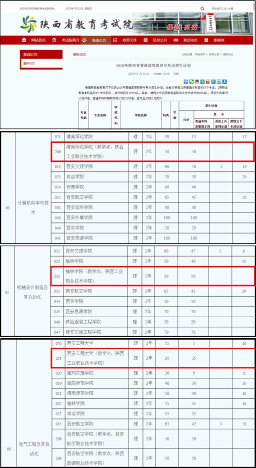 7月23日,陕西省教育考试院官方网站公布2020年陕西省普通高等教育专升本招生计划。此次专升本层次教育招生计划涉及我院电气工程及其自动化(理)、计算机科学与技术(理)、机械设计制造及其自动化(理)三个专业。本次本科层次专业招生工作于2020年开展。