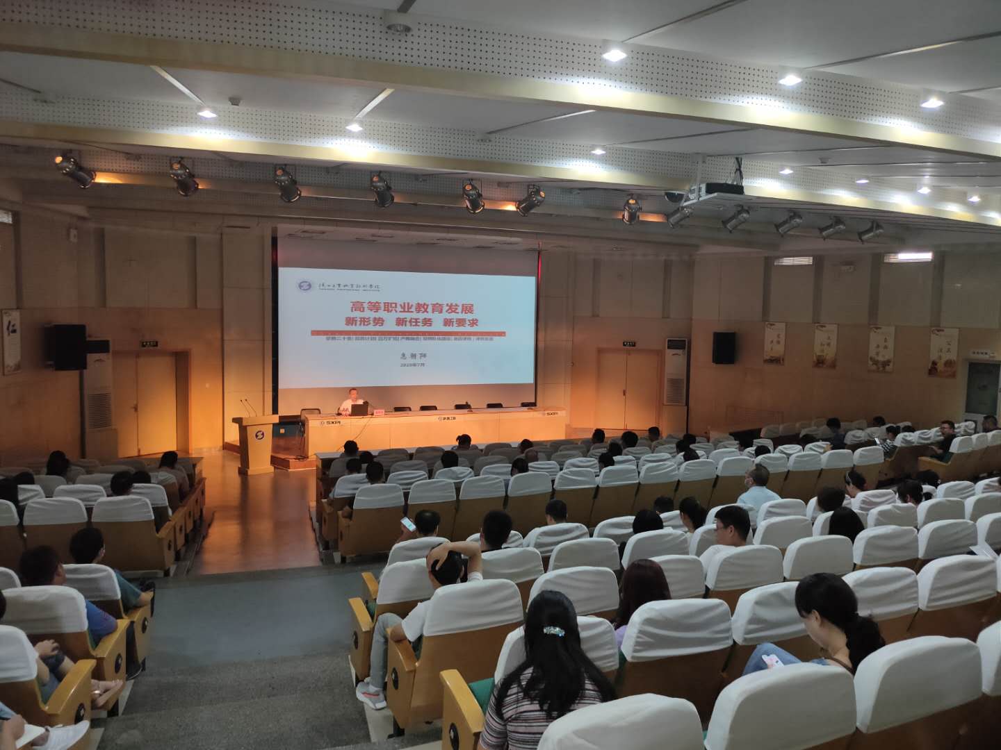 7月27日下午,学院党委书记惠朝阳以《高等职业教育发展新形势、新任务、新要求》为题为2019年度省职教“国培项目”培训班学员作报告。此次报告会在学术会堂举行,参加“1+X证书”Web前端开发、建筑信息模型(BIM),中高衔接电气自动化技术三个培训项目的50多所中、高职院校的100余名教师参加了报告会。