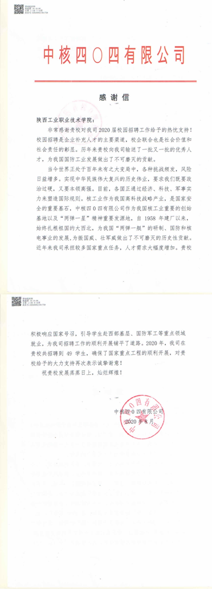 校园招聘是企业补充人才的主要渠道,校企联合也是社会价值和社会责任的彰显。2020年,中核四〇四有限公司在我校举办的专场招聘会上,签约49名学生,确保了国家重点工程的顺利开展,为此公司向学校发来感谢信,对学校给予的大力支持表示诚挚的谢意。