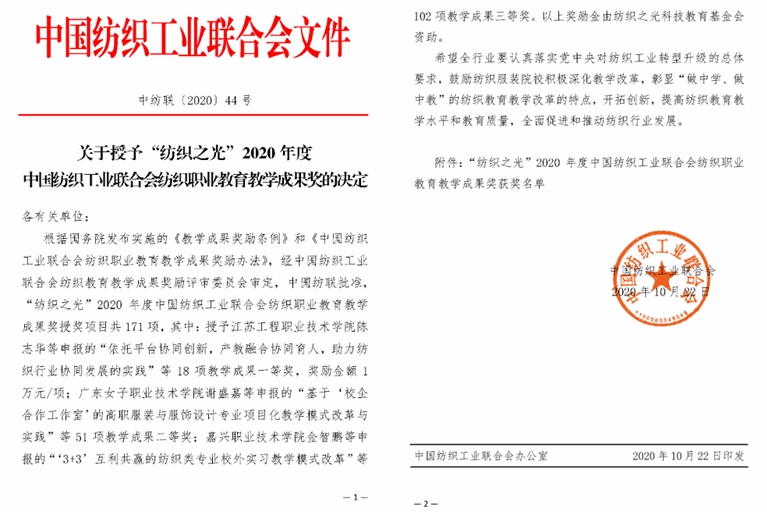 “纺织之光”中国纺织工业联合会纺织教育教学成果奖是依据国务院发布实施的《教学成果奖励条例》和《中国纺织工业联合会纺织职业教育教学成果奖励办法》,皆在鼓励全国纺织服装院校积极深化教学改革,彰显“做中学、做中教”的纺织教育教学改革特点,开拓创新,提高纺织教育教学水平和教育质量,全面促进和推动纺织行业发展。全国纺织职业教育教学成果奖两年评选一次,据悉,本年度中国纺织工业联合会共评选出171项教学成果奖,其中一等奖18项、二等奖51项、三等奖102项。