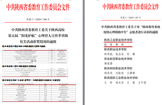 此外,陕西省委教育工委、省教育厅在疫情期间,开通“陕西教育系统疫情心理援助平台”,我校耿丽老师和柳林老师积极参与面向全省师生和人民群众开展疫情相关的心理援助热线和网络支持辅导工作,并荣获“中共陕西省委教育工委关于对‘陕西教育系统疫情心理援助平台’优秀志愿者的通报表彰”。