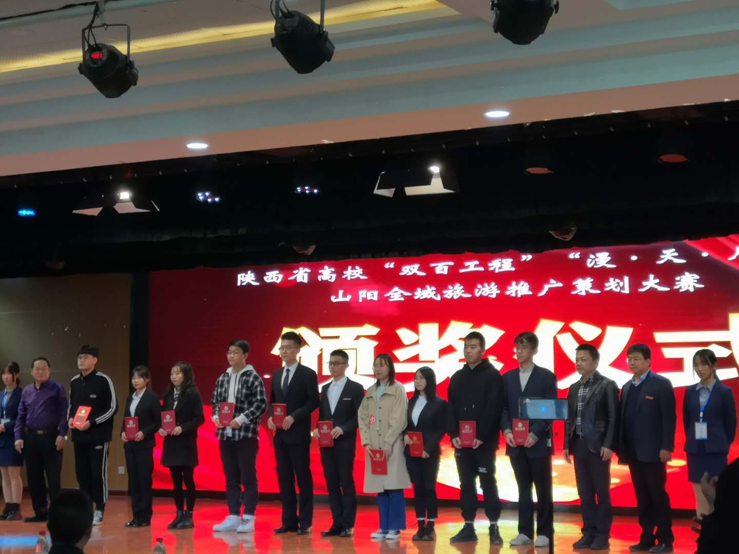10月31日,陕西省高校“双百工程”“漫·天·月”杯山阳全域旅游推广策划大赛总决赛在西北政法大学长安校区举办。我校信息工程学院数字媒体应用技术专业 “六个臭皮匠”团队(胡洋铭、贺煜、杨文婷、郭一玮、党东旭、李珂越)荣获二等奖,“打卤面”团队(李佳豪、胡新鹏、张敏敏、邓亚丽、辛育婷)荣获优秀奖,指导教师赵强、曹珊被评为“优秀指导教师”,数字媒体应用技术专业19级胡洋铭、贺煜、胡新鹏、邓亚丽被山阳县聘为“旅游宣传大使”。