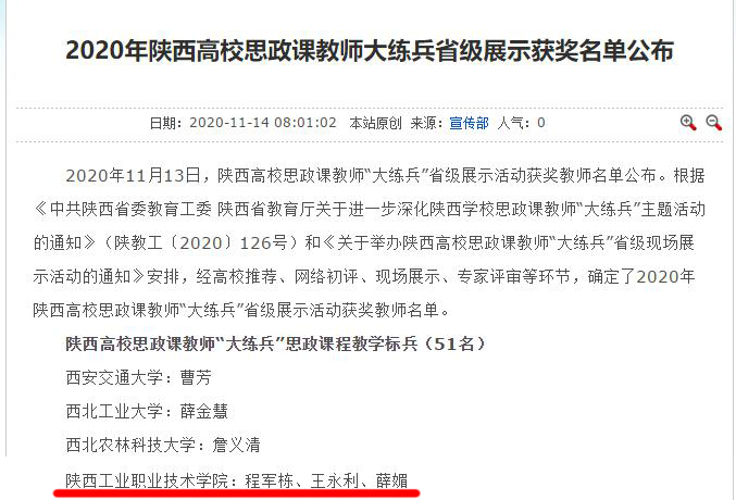 11月12日,2020年陕西高校思政课教师“大练兵”省级展示活动在西北大学举行,我校王永利、程军栋、薛媚同志分别斩获《毛泽东思想和中国特色社会主义理论体系概论》《思想道德修养与法律基础》和《形势与政策》3门思政课程“教学标兵”荣誉称号,我校也成为全省唯一一所包揽3门思政课程“教学标兵”的高职院校。