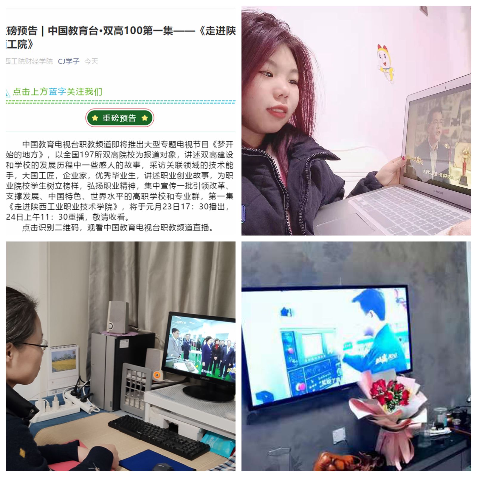 编者按:70年矢志不移办学兴校,建“双高”奋勇争先再创辉煌。中国教育电视台《梦开始的地方之双高100》栏目对我校的专题报道在全校师生以及离退休教职工中引发强烈反响。大家为学校扎根装备制造70载所取得的骄人成绩感慨万千,对身为陕工院人倍感自豪,纷纷表示将立足实际,不负重托,砥砺前行,使“陕西工院”这块金字招牌擦得更亮,叫得更响。