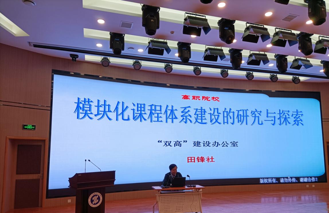 为全面建设模块化课程体系,贯彻落实国家职业教育改革实施方案,推动“双高”建设,3月17日下午我院在学术会堂进行模块化课程体系建设培训会,学院副院长梅创社参加培训会,各二级学院、马克思主义学院、公共课教学部、体育部、美育部等教学部门的150余名教师参加了培训会,会议由教务处副处长李龙龙主持。