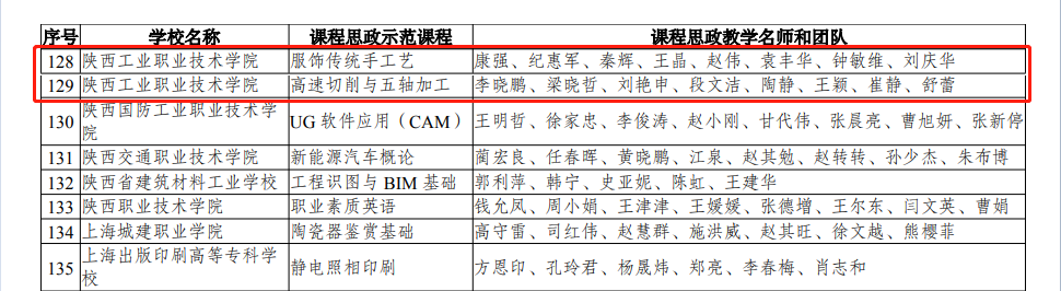 近日,教育部印发《教育部关于公布课程思政示范项目名单的通知》(教高函〔2021〕7号),公布了课程思政示范项目名单。我校课程思政教学研究中心被确定为“课程思政教学研究示范中心”;《服饰传统手工艺》和《高速切削与五轴加工》2门课程被确定为“课程思政示范课程”,其课程的负责人和教学团队被确定为“课程思政教学名师和团队”。