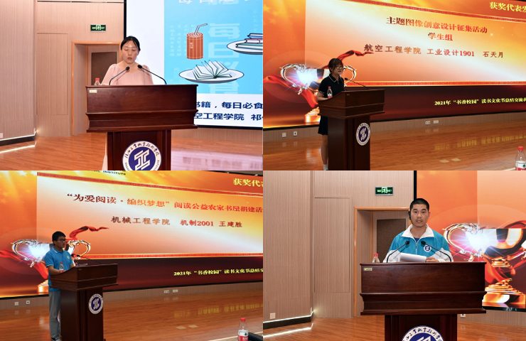 颁奖结束后,主题图像创意设计大赛获奖师生代表祁伟、石天月,“为爱阅读”公益农家书屋捐建活动代表王建胜,“阅读之星”获得者代表杨佳龙先后发表获奖感言并展示了获奖作品。咸阳师院资源环境与历史文化学院赵双全同学和我校土木工程学院郑福禄同学分别以《提高文化认同·坚定文化自信——读<中国文化史导论>有感》和《薪火相传,奋飞不缀——读<中国通史>有感》为题分享了阅读感悟。