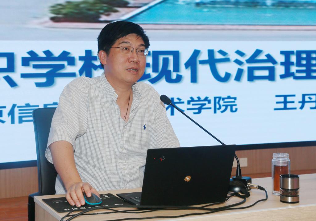 王丹中书记以《高职学校现代治理与数据治校》为题,从高校治理的逻辑起点、高校内部治理结构、内部治理评价、合格高校治理者要求等方面,向在座教师阐述了高校内部治理现代化的内涵和要求,并结合自己在信息化建设领域丰富的工作实践经验和深厚的理论功底,详细介绍了数据治校的特征、要求和重点,以及南京信息职业技术学院数据治校的典型经验。