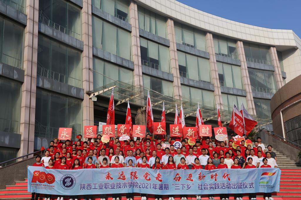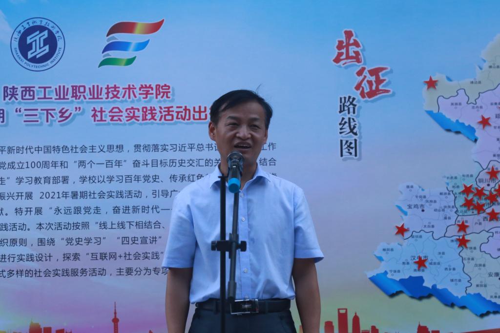 出征仪式在庄严肃穆的国歌声中拉开帷幕。仪式上,宣传部副部长王伟介绍了学校开展2021年大学生暑期“三下乡”社会实践活动的方案;学工部部长郝军宣读了《关于2020年全国大中专学生志愿者暑期“三下乡”社会实践活动的通报》《中共陕西省委宣传部、中共陕西省委教育工委、共青团陕西省委等关于2020年陕西省大中专学生志愿者暑期文化科技卫生“三下乡”社会实践活动先进集体、先进个人的通报》以及《关于表彰我校2020年暑期社会实践活动的通知》;团委书记赵双军宣读了《关于陕西工业职业技术学院2021年暑期社会实践校级立项团队的通知》。