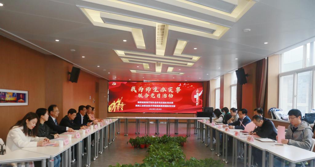 11月18日,陕西省教育厅外事处(港澳台办)党支部与我校继教美育国际党支部联合开展结对共建活动。陕西省教育厅对外合作与交流处处长文通,副处长郭宏毅、张亮,省教育厅国际交流与留学服务中心主任相勇一行,我校党委副书记田昊、国际教育学院院长秦景俊、财经与旅游学院党总支书记孙继龙、继教美育国际党支部书记贾严鹏及支部相关党员参加了活动。