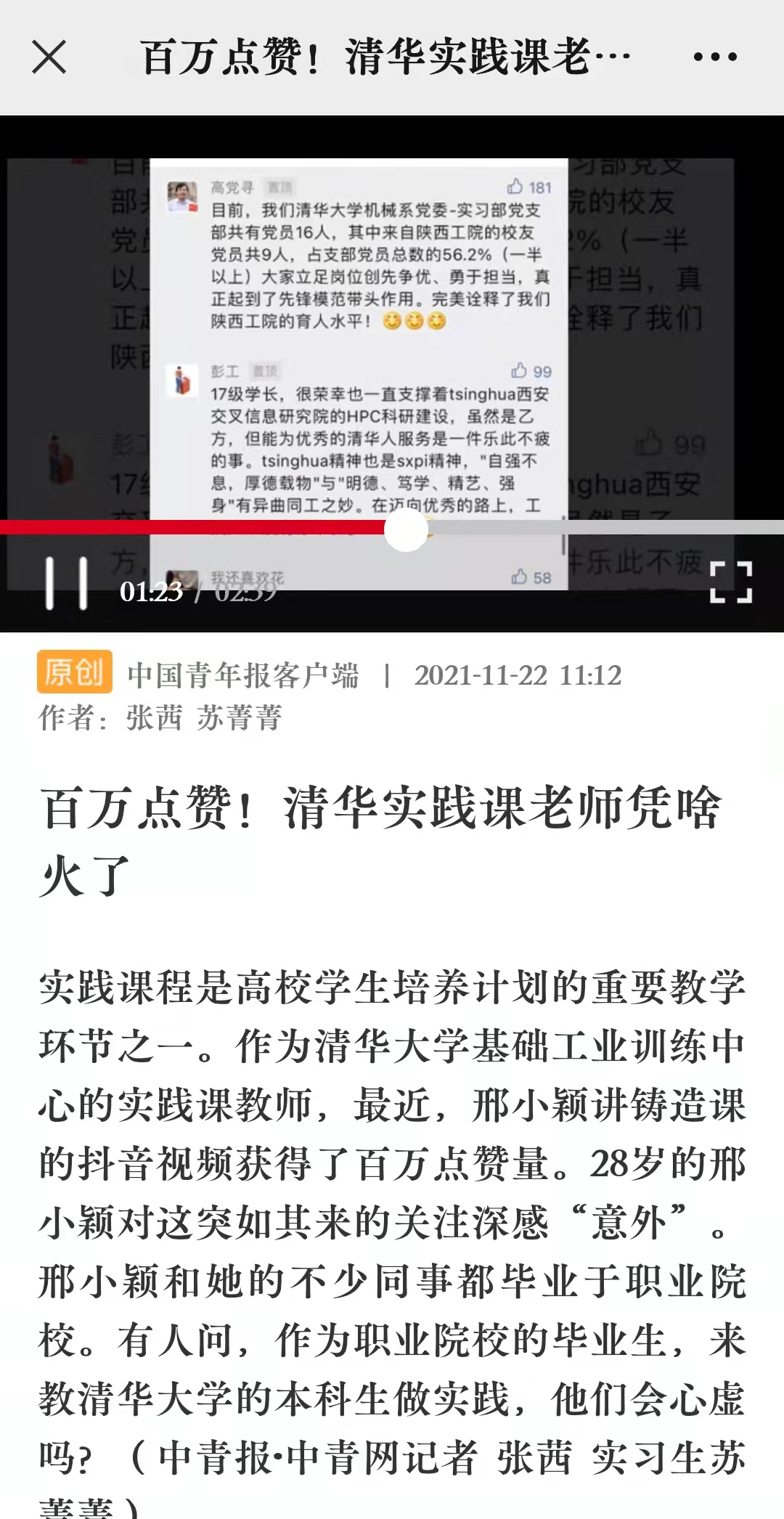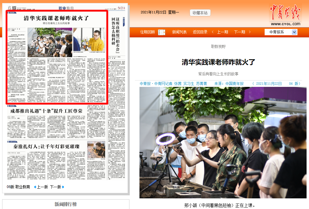今日(22日)出版的《中国青年报》在其第六版头条以《清华实践课老师咋就火了,背后有着向上生长的故事》为题,关注我校在清华大学基础工业训练中心担任实践指导教师的毕业生群体。全文转载如下: