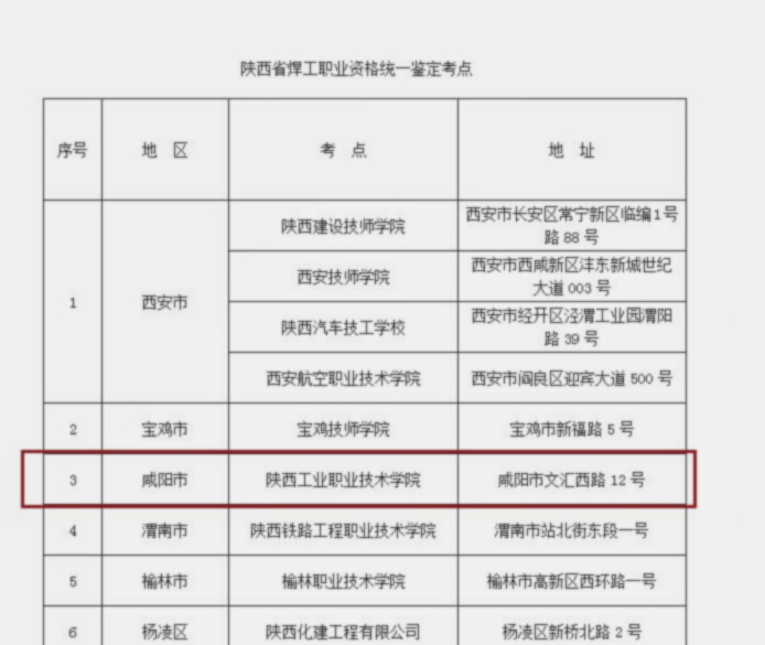 陕西省焊工职业资格统一鉴定考点