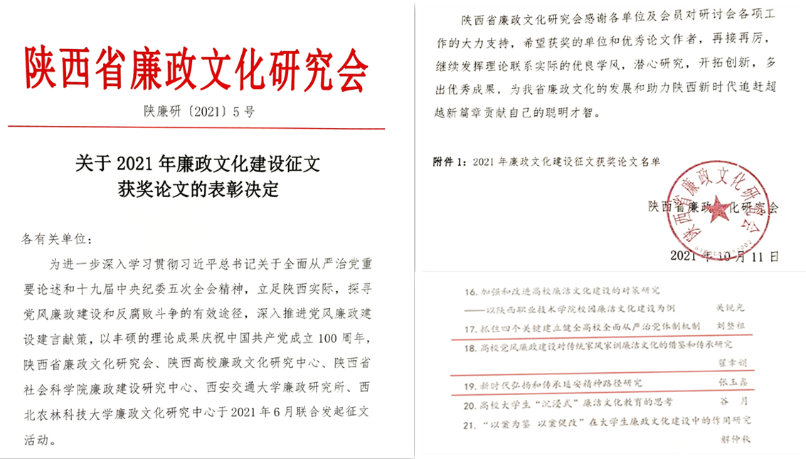 近日,陕西省廉政文化研究会发布了《关于2021年廉政文化建设征文获奖论文的表彰决定》,下发了荣誉证书,我校纪委综合室刘整祖老师、马克思主义学院翟幸娟老师、党委宣传部张玉鑫老师投稿文章均荣获三等奖。