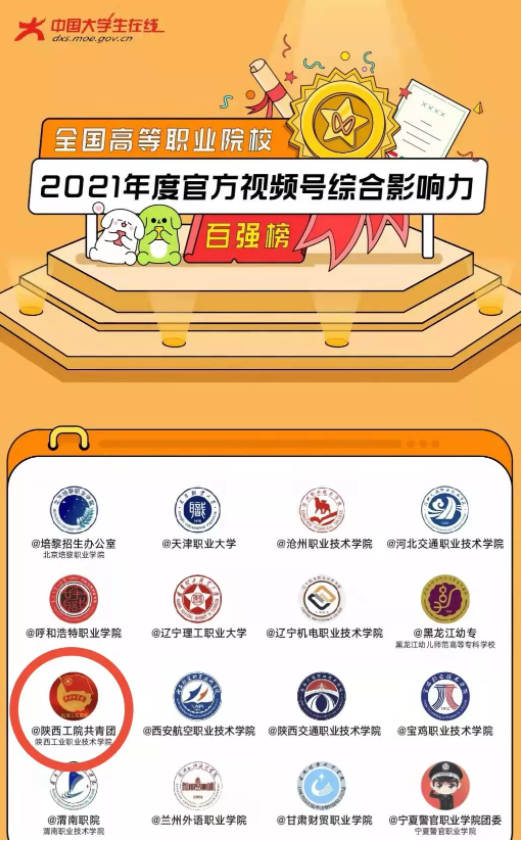 2021年12月31日,教育部主办的“中国大学生在线”公布了“全国高等职业院校2021年度官方视频号综合影响力百强榜”,我校团委官方视频号“陕西工院共青团”微信视频号成功入围。“中国大学生在线”是由教育部主导并推动,全国大学生参与,全国高校合作共建的网络文化建设与主题教育平台,集中展示高校风采、发布主题活动、聚合教育信息。榜单评选体现了全国高校视频号在一个周期内的多个维度综合影响力排名,综合考察账号活跃度、传播力、互动值以及重点网络文化活动参与度、示范带动作用等多维度的评价。