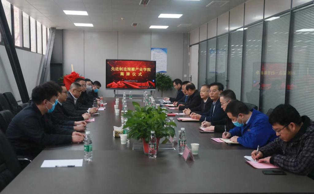 在听取了先进制造精雕产业学院建设情况、精雕学徒班学员学习情况的汇报后,与会领导共同为校企共建“先进制造精雕产业学院”揭牌。随后,双方就专业建设、人才培养、校企合作、科研开发、社会服务、师资任用、项目建设进行了深度交流和座谈。