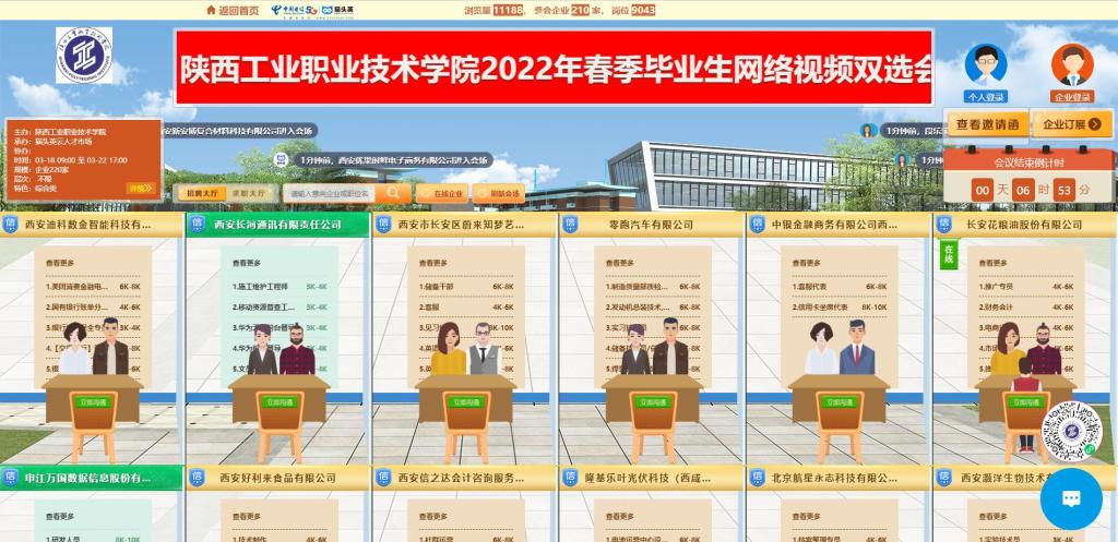 本次双选会邀请了陕西省旅游设计院有限责任公司、西安曲江文化旅游股份有限公司、西安建工市政交通集团有限公司等210家用人单位,其中民营企业186家,国企19家,上市公司3家,外企2家,共提供就业岗位9065个,参会学生1148人,投递简历801份,意向达成度达到96%以上。在网络双选会举办期间,用人单位点击“视频面试大厅”,可以查看学生投递的电子简历,与学生进行互动交流。学生足不出户就可以在网上了解各大招聘单位,通过发送电子简历、参加视频面试,双向选择合适的工作岗位。