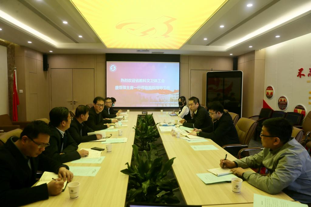 党委副书记贺天柱同志代表学院对省教科文卫体工会副主席唐煜弢一行来校调研表示欢迎,对省总工会、省教科文卫体工会长期以来对学院工作的大力支持表示感谢。相关部门负责同志逐一围绕调研内容,就相关工作开展情况进行了汇报。随后,与会人员聚焦产业工人队伍建设中的职工技能培训、技能大赛举办、师资队伍建设、实验实训条件、高技能人才培养等方面进行了深入探讨交流。