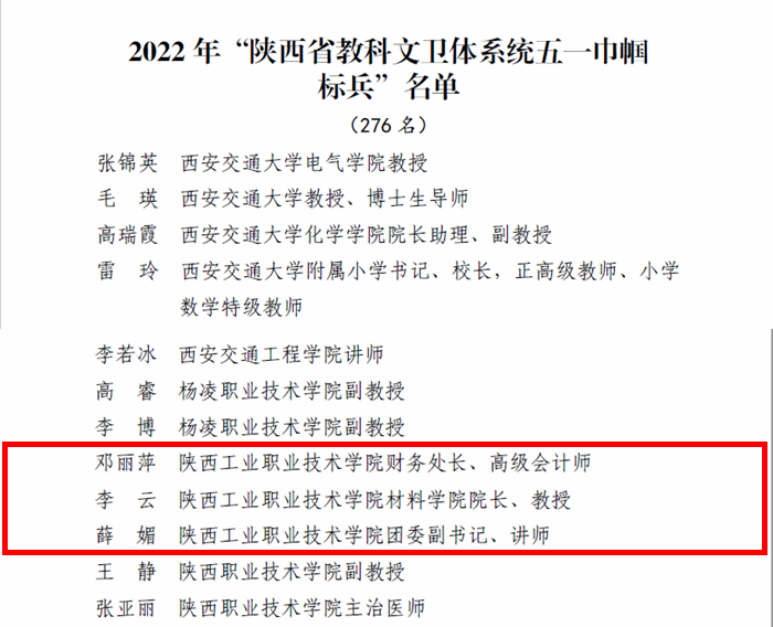 在“五一”国际劳动节到来之际,为大力弘扬劳模精神、劳动精神、工匠精神,激励广大女职工奋进新征程、建功新时代,近期,陕西省教科文卫体工会对2022年陕西省教科文卫体系统“五一巾帼标兵岗”和“五一巾帼标兵”进行了通报表彰,我校现代信息技术创新教学团队、心理咨询中心2个单位荣获“陕西省教科文卫体系统五一巾帼标兵岗”荣誉称号,邓丽萍、李云、薛媚3位女同志荣获“陕西省教科文卫体系统五一巾帼标兵”荣誉称号。