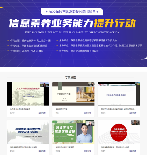 7月25日下午,由陕西省职业教育高等学校图书情报工作委员会主办、陕西省职教高校图工委信息素养与技术工作组和陕西工业职业技术学院承办、北京智信数图科技有限公司协办的2022年陕西省高职院校图书馆员信息素养业务能力提升行动正式拉开序幕。