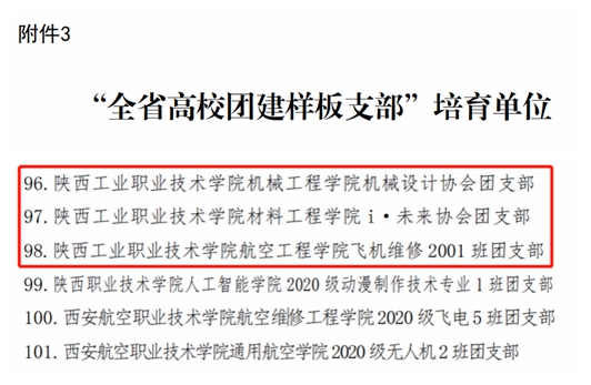 近日,共青团陕西省委、中共陕西省委教育工委公布了全省高校团建示范单位培育资格名单,我校信息工程学院团总支、财经与旅游学院团总支入选“全省高校团建标杆院系”培育单位;机械工程学院机械设计协会团支部、材料工程学院 i·未来协会团支部、航空工程学院飞机维修2001班团支部入选“全省高校团建样板支部”培育单位名单。
