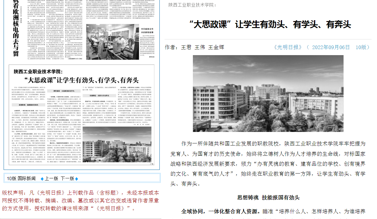 不负韶华行且知,为有源头活水来。陕西工业职业技术学院将践行好培养堪当民族复兴重任的时代新人使命,持续推进“大思政课”建设,教育引导学生“为获得知识和技能走进来,为服务祖国和人民走出去”,在全面建设社会主义现代化国家新征程中大有可为、大有作为。