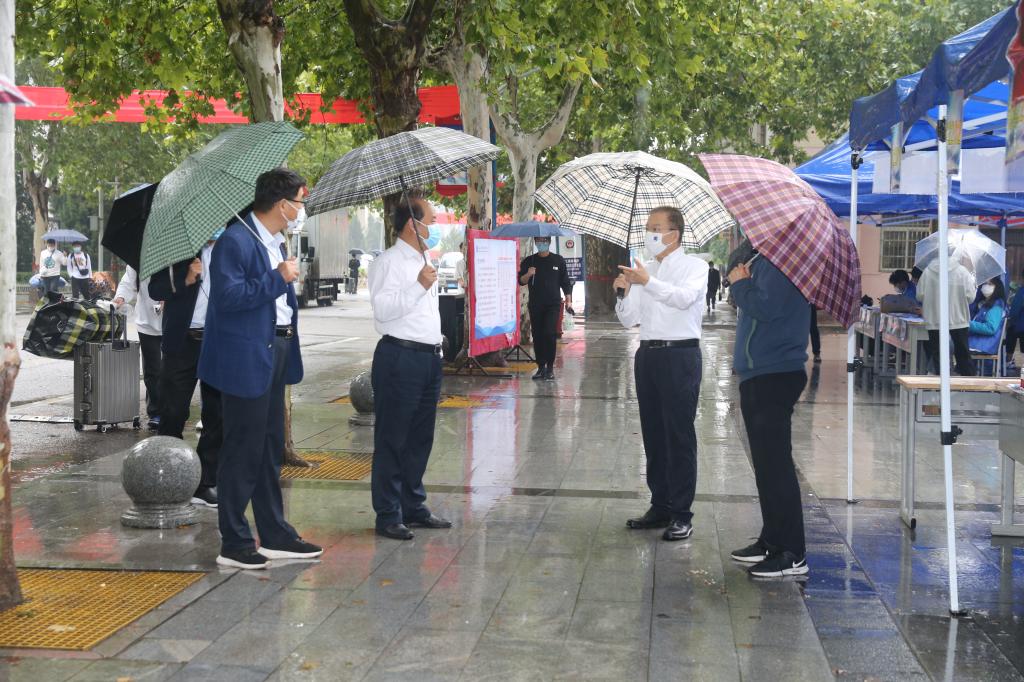 学校领导高度重视新生报到工作,在细雨中先后来到迎新现场,对校园整体迎新氛围、各站点工作情况、疫情防控和新生住宿等各个环节进行了仔细检查,详细询问了迎新工作的具体安排,了解学生的手续办理情况并与新生亲切交谈,了解同学需求,鼓励新生积极转变角色,熟悉校园环境,尽快融入校园生活。