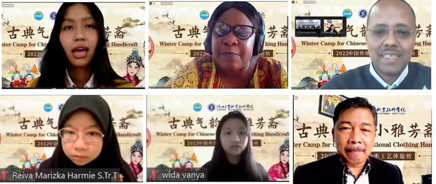 12月13日下午,教育部中外语言交流合作中心主办,我校承办的“汉语桥”线上团组交流项目--“古典气韵,小雅芳斋中国传统服饰手工艺体验坊”开营仪式以视频会议的形式举行。校党委副书记、纪委书记康强,党委副书记田昊,印尼三宝垄维瓦学院院长苏桑托博士、印尼曼达拉理工学院院长苏维尼奥博士、尼日利亚奥法理工学院研究与创新理事会科特·格雷斯博士、泰国职教集团国际合作部部长帕特塔查苏、埃塞俄比亚温格德理工学院东非技能中心主任策加耶等出席仪式。来自印尼、泰国、尼日利亚、埃塞俄比亚等多所学校的300余名师生参加了活动。会议由国际教育学院院长秦景俊主持。