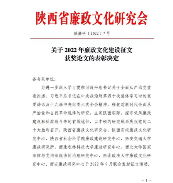 近日,陕西省廉政文化研究会公布了《关于2022年廉政文化建设征文获奖论文的表彰决定》,我校共有21项作品获奖,其中信息工程学院党总支薛昊、机械工程学院党总支张亦乐荣获二等奖,梁琳琳等9位教师荣获三等奖;张木等10位教师荣获优秀奖。学校荣获优秀组织奖。