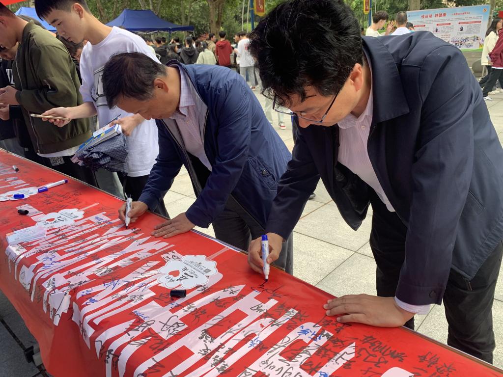 党委副书记贺天柱、学工部部长、学生处处长郝军在横幅上签名